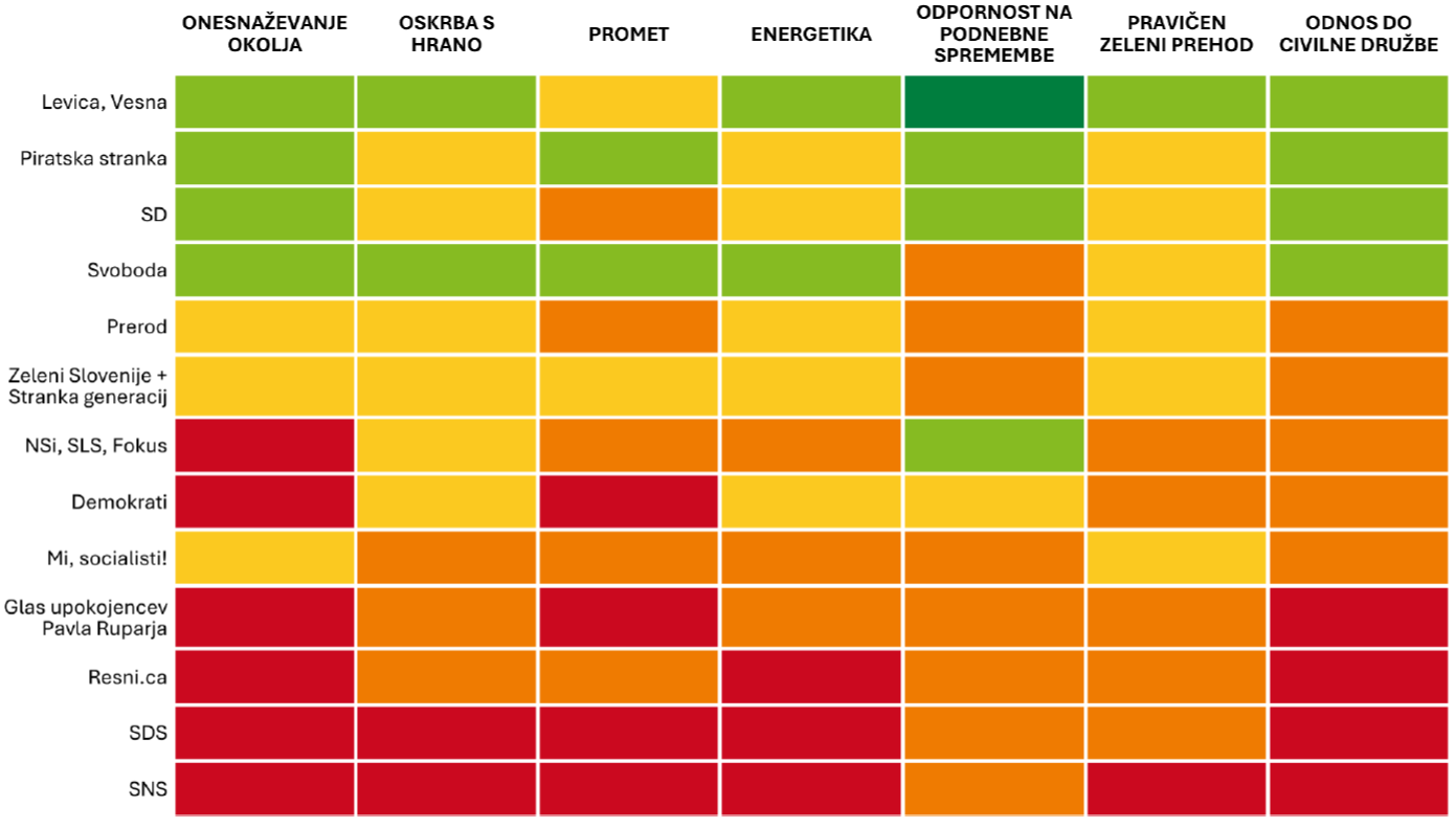 V gibanju smo skupaj z Umanotero naredili analizo trinajstih strank, ki bodo kandidirale na državnozborskih volitvah. Ocenjevali smo njihove programske točke na sedmih ključnih področjih – onesnaževanje, oskrba s hrano, promet, energetika, odpornost na podnebne spremembe, pravičen zeleni prehod in odnos do civilne družbe – z ocenami od 1 do 5. Oceno 1 je za določeno področje dobila stranka, ki je predlagala škodljive ukrepe in oceno 5 je dobila stranka, ki je predlagala ustrezne in konkretne ukrepe.